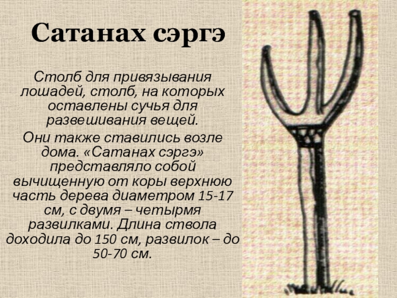Они также ставились возле дома. «Сатанах сэргэ» представляло собой вычищенную от коры верхнюю часть дерева диаметром 15-17 см, с двумя – четырмя развилками. Длина ствола доходила до 150 см, развилок – до 50-70 см.