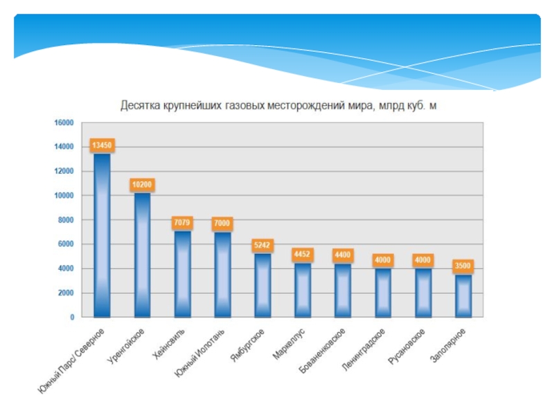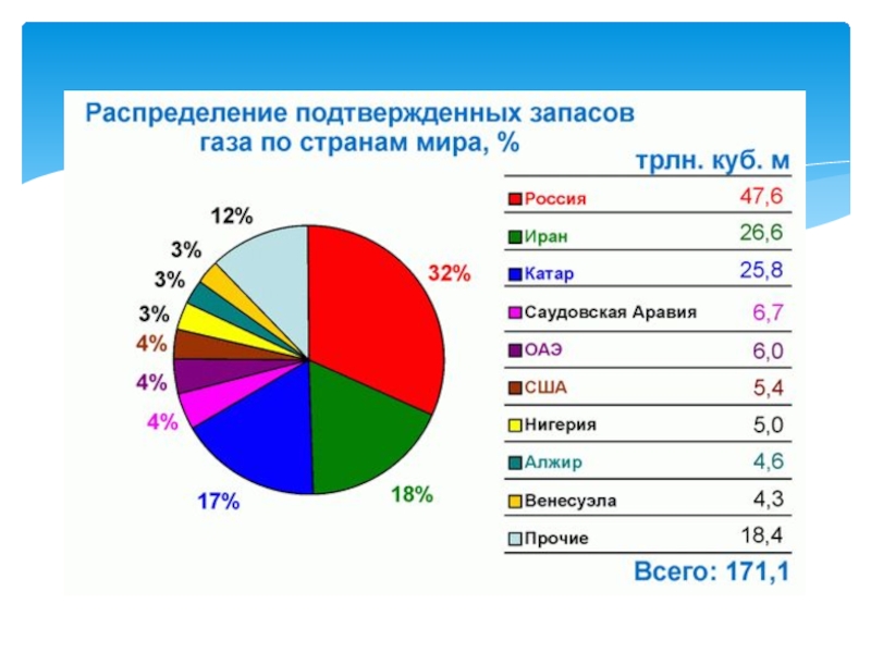 По запасам природного газа Российская Федерация занимает первое место в мире. Ее разведанные запасы на 2013 год оцениваются примерно в 46.7 трлн. кубических метров. Это составляет около 32% всех мировых запасов.