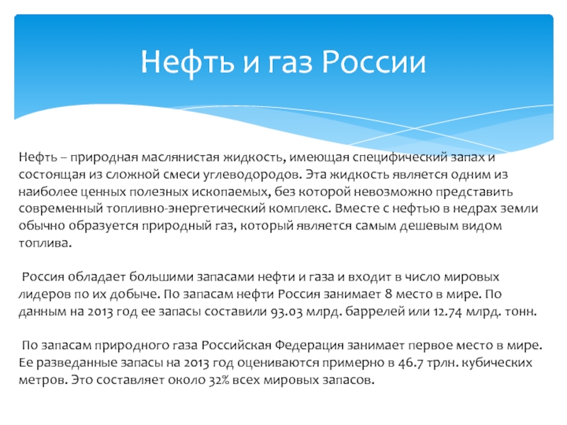 Нефть и газ РоссииНефть – природная маслянистая жидкость, имеющая специфический запах и состоящая из сложной смеси углеводородов. Эта