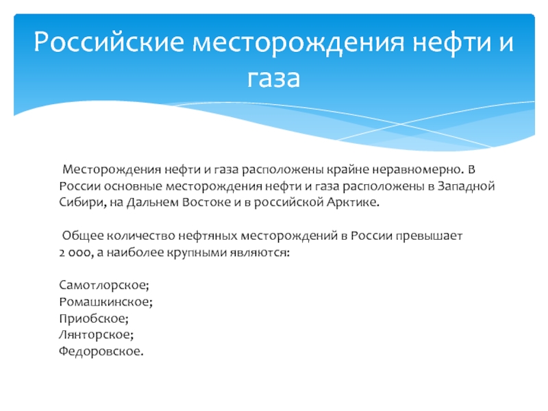 Общее количество нефтяных месторождений в России превышает 2 000, а наиболее крупными являются: