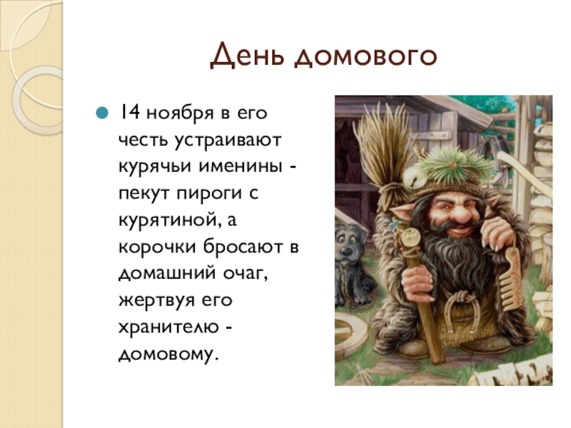 День домового14 ноября в его честь устраивают курячьи именины - пекут пироги с курятиной, а корочки бросают