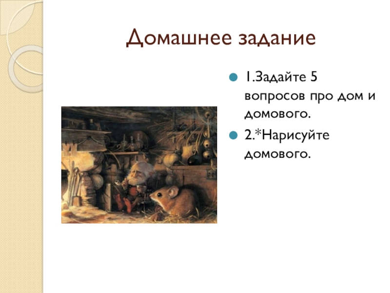 Домашнее задание1.Задайте 5 вопросов про дом и домового.2.*Нарисуйте домового.
