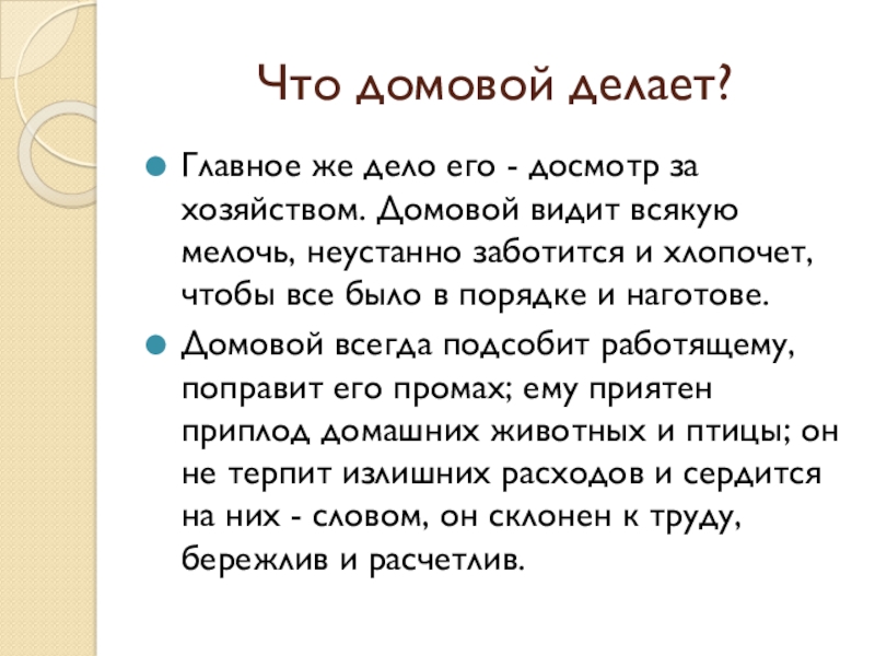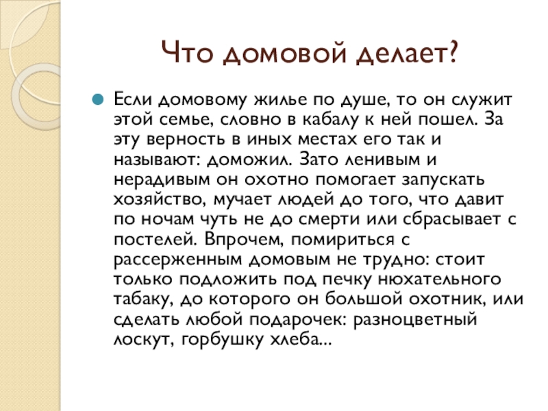 Что домовой делает?Если домовому жилье по душе, то он служит этой семье, словно в кабалу к ней