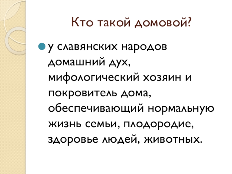 Кто такой домовой?у славянских народов домашний дух, мифологический хозяин и покровитель дома, обеспечивающий нормальную жизнь семьи, плодородие,