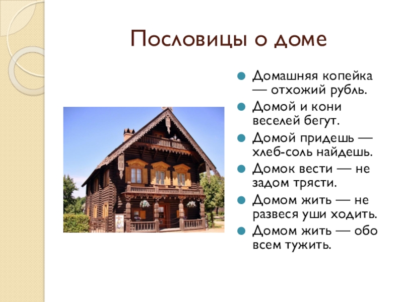 Слайд 1Дом хозяйку ждет, а хозяйка — хозяина.