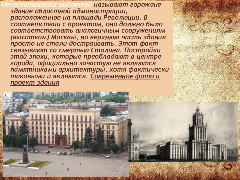 Слайд 11Несостоявшейся высоткой называют горожане здание областной администрации, расположенное на площади Революции.