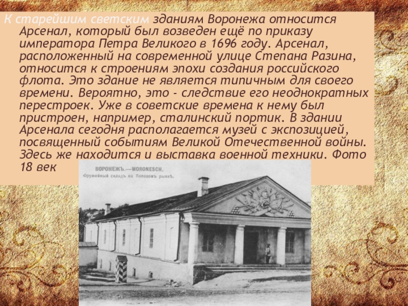 Слайд 3К старейшим светским зданиям Воронежа относится Арсенал, который был возведен ещё