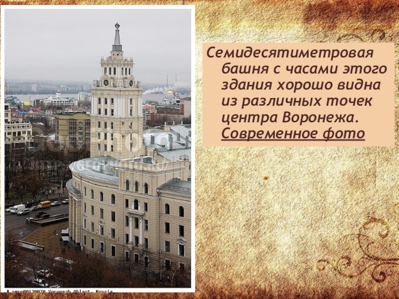 Слайд 10Семидесятиметровая башня с часами этого здания хорошо видна из различных точек