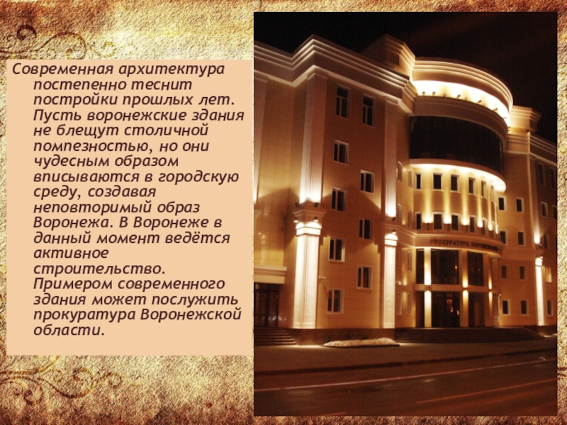 блещут столичной помпезностью, но они чудесным образом вписываются в городскую среду, создавая неповторимый образ Воронежа. В Воронеже в данный момент ведётся активное строительство. Примером современного здания может послужить прокуратура Воронежской области.