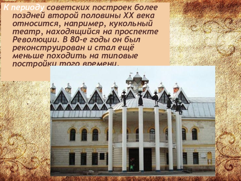 например, кукольный театр, находящийся на проспекте Революции. В 80-е годы он был реконструирован и стал ещё меньше походить на типовые постройки того времени.