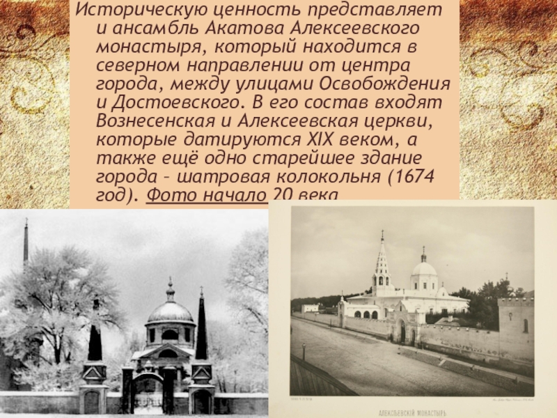 Слайд 6Историческую ценность представляет и ансамбль Акатова Алексеевского монастыря, который находится в