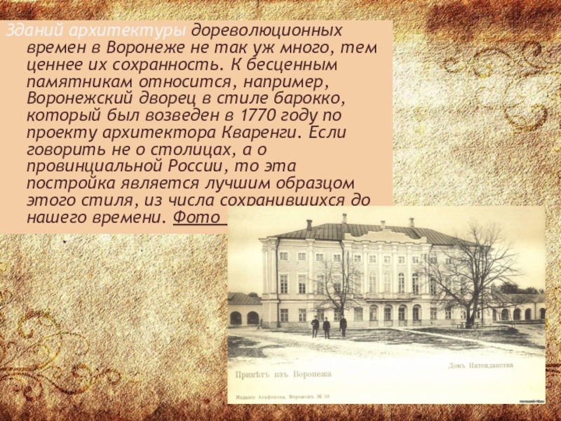Слайд 7Зданий архитектуры дореволюционных времен в Воронеже не так уж много, тем