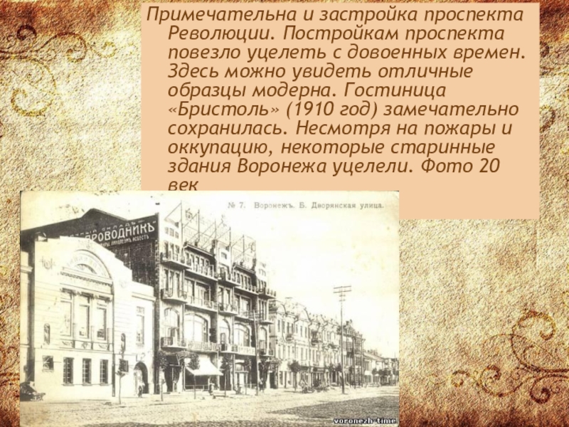 времен. Здесь можно увидеть отличные образцы модерна. Гостиница «Бристоль» (1910 год) замечательно сохранилась. Несмотря на пожары и оккупацию, некоторые старинные здания Воронежа уцелели. Фото 20 век