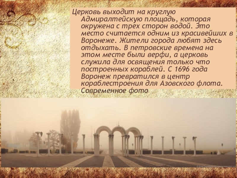 водой. Это место считается одним из красивейших в Воронеже. Жители города любят здесь отдыхать. В петровские времена на этом месте были верфи, а церковь служила для освящения только что построенных кораблей. С 1696 года Воронеж превратился в центр кораблестроения для Азовского флота. Современное фото