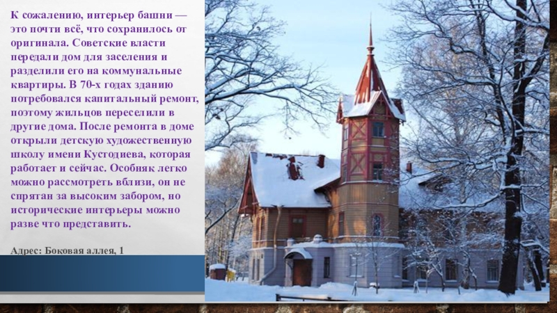 оригинала. Советские власти передали дом для заселения и разделили его на коммунальные квартиры. В 70-х годах зданию потребовался капитальный ремонт, поэтому жильцов переселили в другие дома. После ремонта в доме открыли детскую художественную школу имени Кустодиева, которая работает и сейчас. Особняк легко можно рассмотреть вблизи, он не спрятан за высоким забором, но исторические интерьеры можно разве что представить.