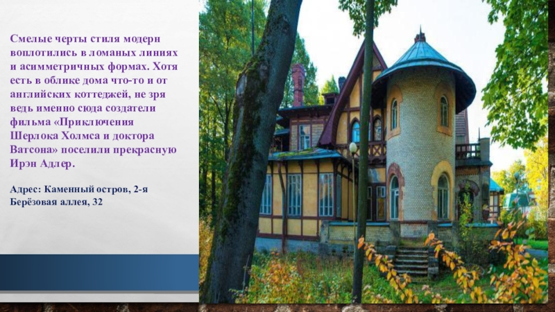 Хотя есть в облике дома что-то и от английских коттеджей, не зря ведь именно сюда создатели фильма «Приключения Шерлока Холмса и доктора Ватсона» поселили прекрасную Ирэн Адлер.