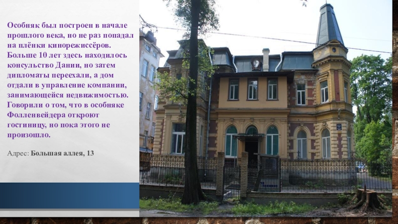 на плёнки кинорежиссёров. Больше 10 лет здесь находилось консульство Дании, но затем дипломаты переехали, а дом отдали в управление компании, занимающейся недвижимостью. Говорили о том, что в особняке Фолленвейдера откроют гостиницу, но пока этого не произошло.