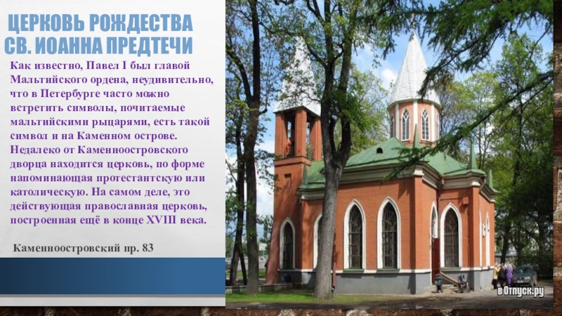 Мальтийского ордена, неудивительно, что в Петербурге часто можно встретить символы, почитаемые мальтийскими рыцарями, есть такой символ и на Каменном острове. Недалеко от Каменноостровского дворца находится церковь, по форме напоминающая протестантскую или католическую. На самом деле, это действующая православная церковь, построенная ещё в конце XVIII века.