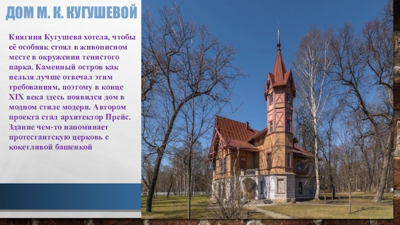 живописном месте в окружении тенистого парка. Каменный остров как нельзя лучше отвечал этим требованиям, поэтому в конце XIX века здесь появился дом в модном стиле модерн. Автором проекта стал архитектор Прейс. Здание чем-то напоминает протестантскую церковь с кокетливой башенкой