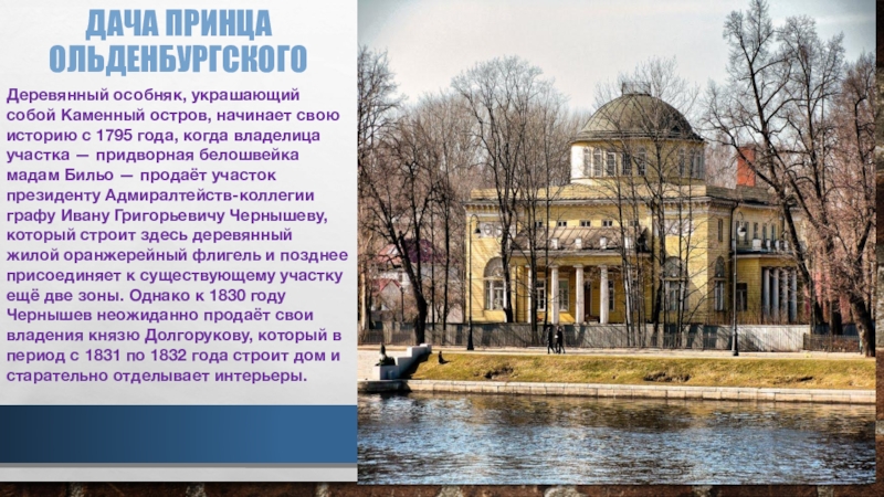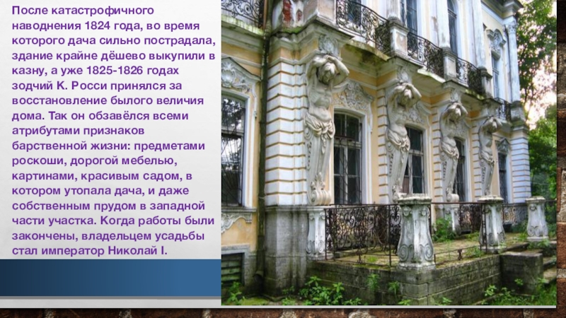 Слайд 14После катастрофичного наводнения 1824 года, во время которого дача сильно пострадала,