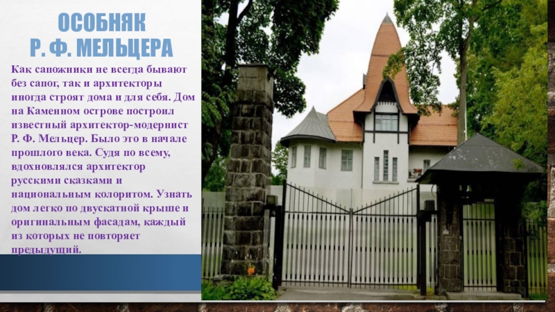 так и архитекторы иногда строят дома и для себя. Дом на Каменном острове построил известный архитектор-модернист Р. Ф. Мельцер. Было это в начале прошлого века. Судя по всему, вдохновлялся архитектор русскими сказками и национальным колоритом. Узнать дом легко по двускатной крыше и оригинальным фасадам, каждый из которых не повторяет предыдущий.