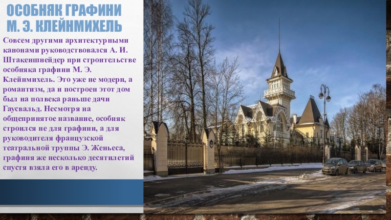 Штакеншнейдер при строительстве особняка графини М. Э. Клейнмихель. Это уже не модерн, а романтизм, да и построен этот дом был на полвека раньше дачи Гаусвальд. Несмотря на общепринятое название, особняк строился не для графини, а для руководителя французской театральной труппы Э. Женьеса, графиня же несколько десятилетий спустя взяла его в аренду.
