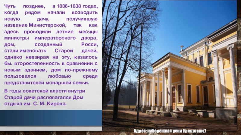 Слайд 15Чуть позднее, в 1836-1838 годах, когда рядом начали возводить новую дачу, получившую название Министерской,