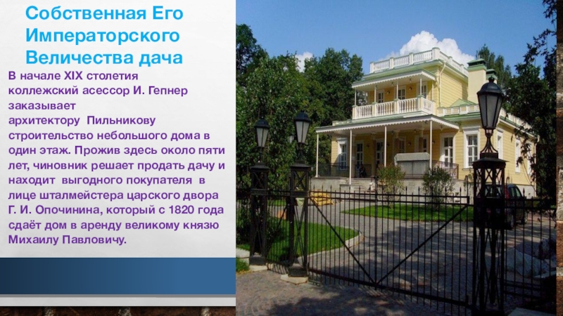 архитектору Пильникову строительство небольшого дома в один этаж. Прожив здесь около пяти лет, чиновник решает продать дачу и находит выгодного покупателя в лице шталмейстера царского двора Г. И. Опочинина, который с 1820 года сдаёт дом в аренду великому князю Михаилу Павловичу.