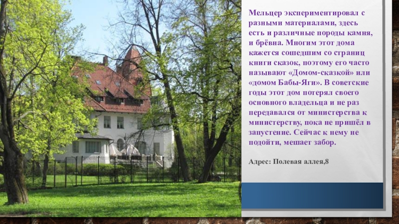 и брёвна. Многим этот дома кажется сошедшим со страниц книги сказок, поэтому его часто называют «Домом-сказкой» или «домом Бабы-Яги». В советские годы этот дом потерял своего основного владельца и не раз передавался от министерства к министерству, пока не пришёл в запустение. Сейчас к нему не подойти, мешает забор.