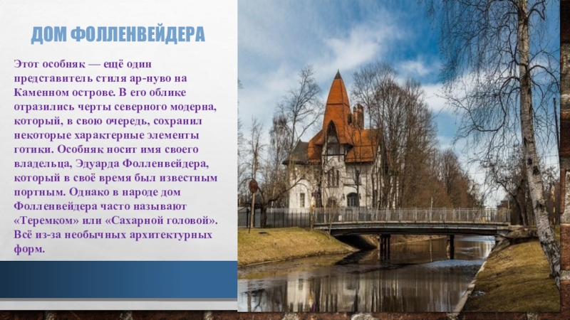 острове. В его облике отразились черты северного модерна, который, в свою очередь, сохранил некоторые характерные элементы готики. Особняк носит имя своего владельца, Эдуарда Фолленвейдера, который в своё время был известным портным. Однако в народе дом Фолленвейдера часто называют «Теремком» или «Сахарной головой». Всё из-за необычных архитектурных форм.