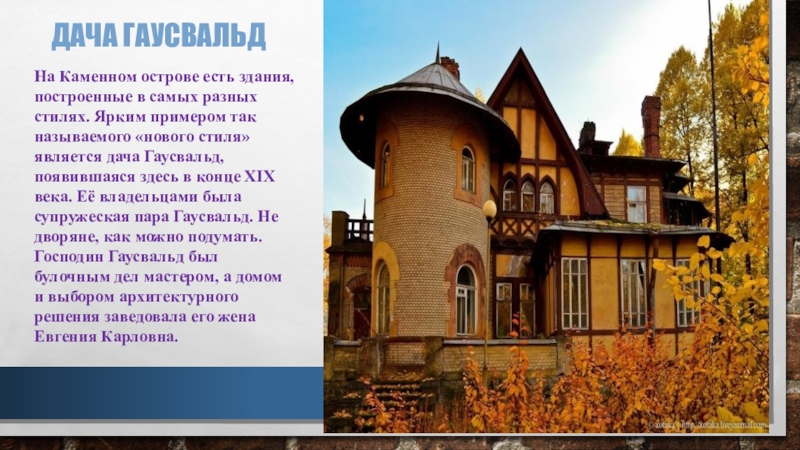 Ярким примером так называемого «нового стиля» является дача Гаусвальд, появившаяся здесь в конце XIX века. Её владельцами была супружеская пара Гаусвальд. Не дворяне, как можно подумать. Господин Гаусвальд был булочным дел мастером, а домом и выбором архитектурного решения заведовала его жена Евгения Карловна.