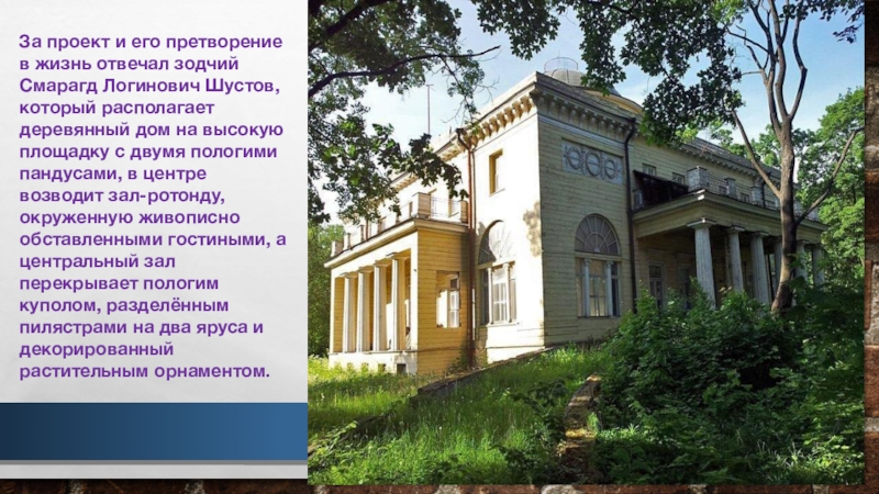 Шустов, который располагает деревянный дом на высокую площадку с двумя пологими пандусами, в центре возводит зал-ротонду, окруженную живописно обставленными гостиными, а центральный зал перекрывает пологим куполом, разделённым пилястрами на два яруса и декорированный растительным орнаментом.