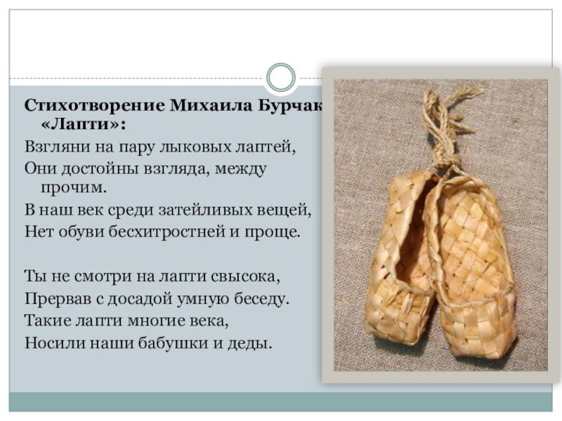 Слайд 20Стихотворение Михаила Бурчак «Лапти»: