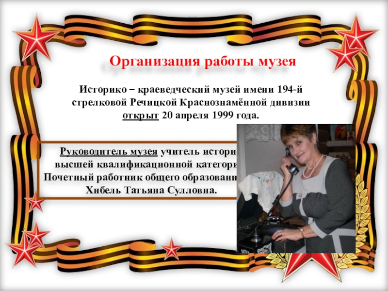 Руководитель музея учитель истории высшей квалификационной категории, Почетный работник общего образования РФ Хибель Татьяна Сулловна.