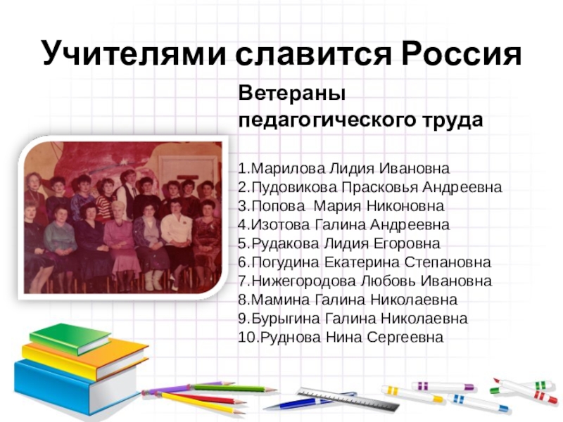 1.Петрова Елена Леонидовна 7.Шмырева Валентина Павловна