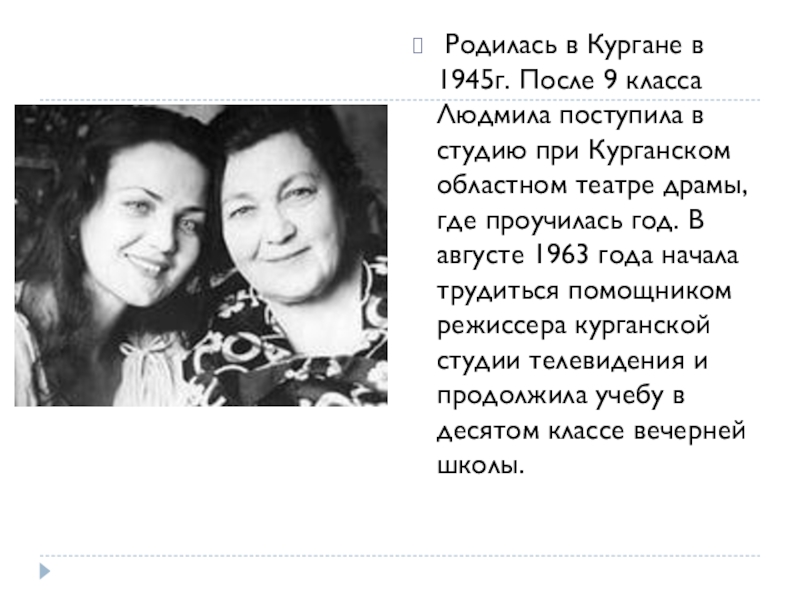 Слайд 2 Родилась в Кургане в 1945г. После 9 класса Людмила поступила в