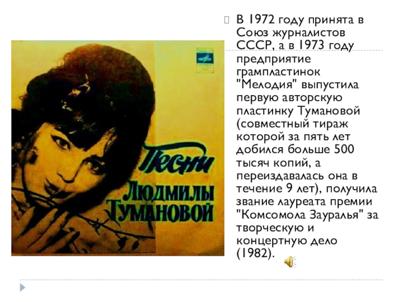 В 1972 году принята в Союз журналистов СССР, а в 1973 году предприятие грампластинок