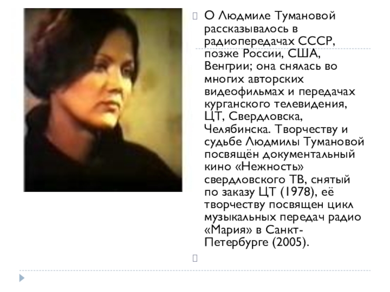 Слайд 10О Людмиле Тумановой рассказывалось в радиопередачах СССР, позже России, США, Венгрии;