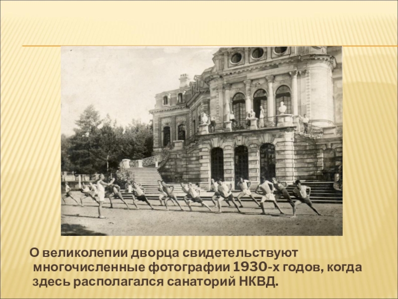 Слайд 29О великолепии дворца свидетельствуют многочисленные фотографии 1930-х годов, когда здесь располагался