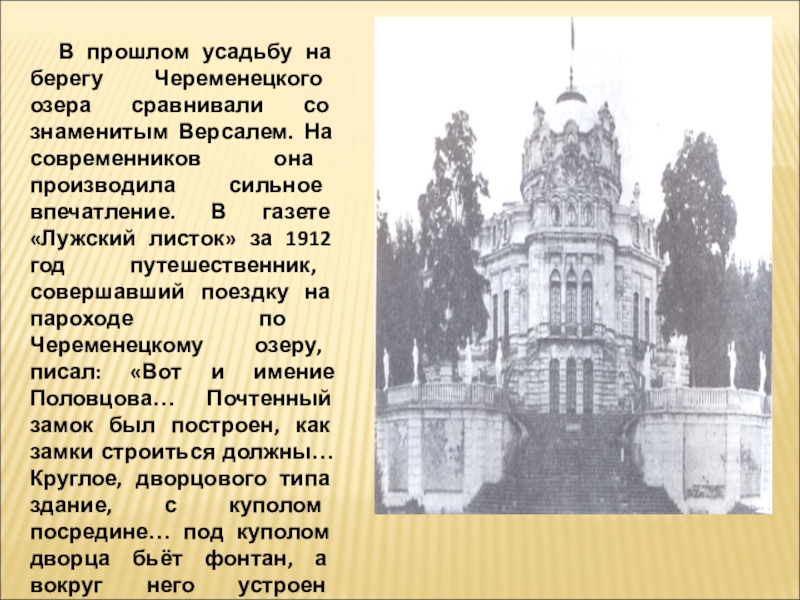Слайд 15В прошлом усадьбу на берегу Череменецкого озера сравнивали со знаменитым Версалем.