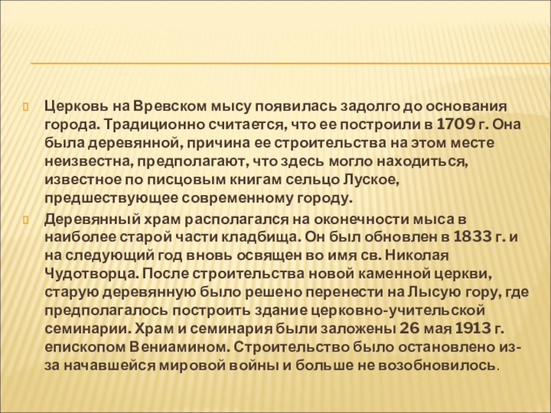 Церковь на Вревском мысу появилась задолго до основания города. Традиционно считается,