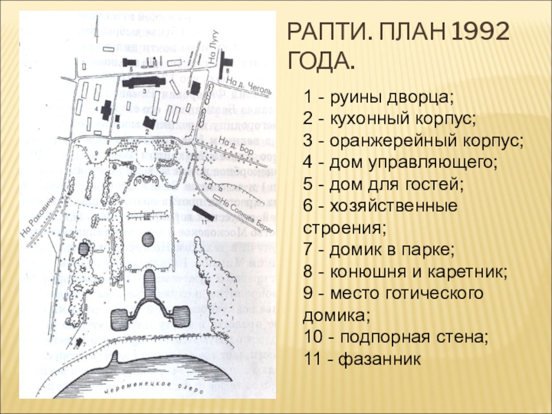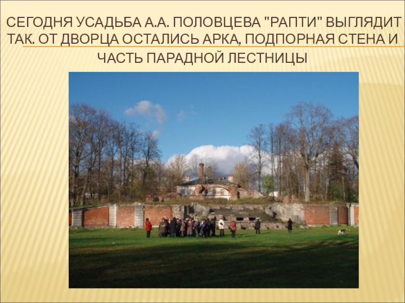 Слайд 41СЕГОДНЯ УСАДЬБА А.А. ПОЛОВЦЕВА "РАПТИ" ВЫГЛЯДИТ ТАК. ОТ ДВОРЦА ОСТАЛИСЬ АРКА, ПОДПОРНАЯ