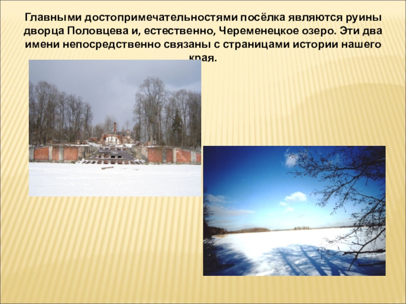 Слайд 17Главными достопримечательностями посёлка являются руины дворца Половцева и, естественно, Череменецкое озеро.