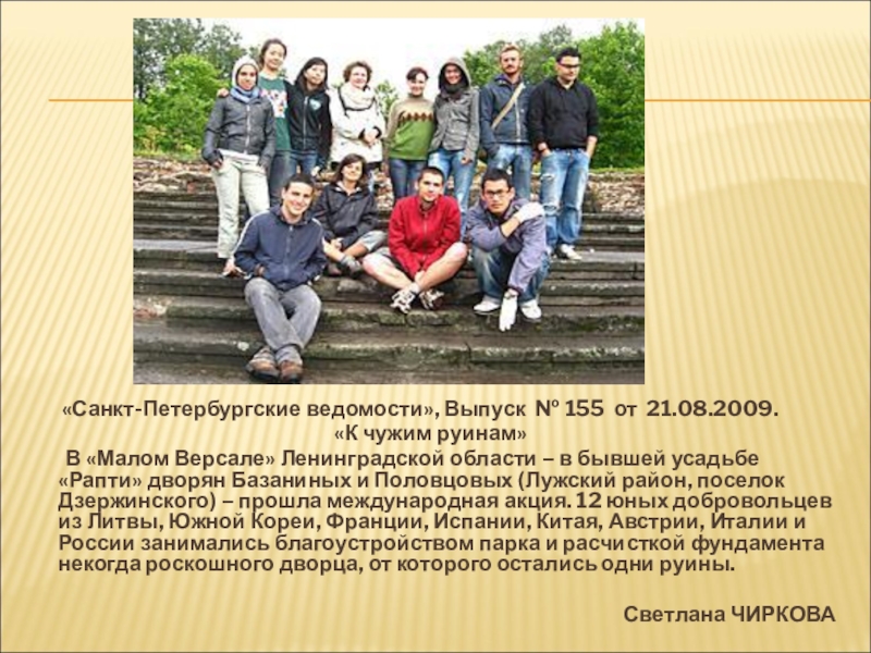 В «Малом Версале» Ленинградской области – в бывшей усадьбе «Рапти» дворян Базаниных и Половцовых (Лужский район, поселок Дзержинского) – прошла международная акция. 12 юных добровольцев из Литвы, Южной Кореи, Франции, Испании, Китая, Австрии, Италии и России занимались благоустройством парка и расчисткой фундамента некогда роскошного дворца, от которого остались одни руины.