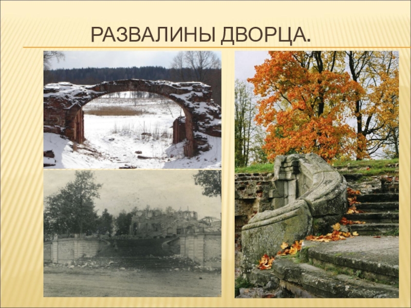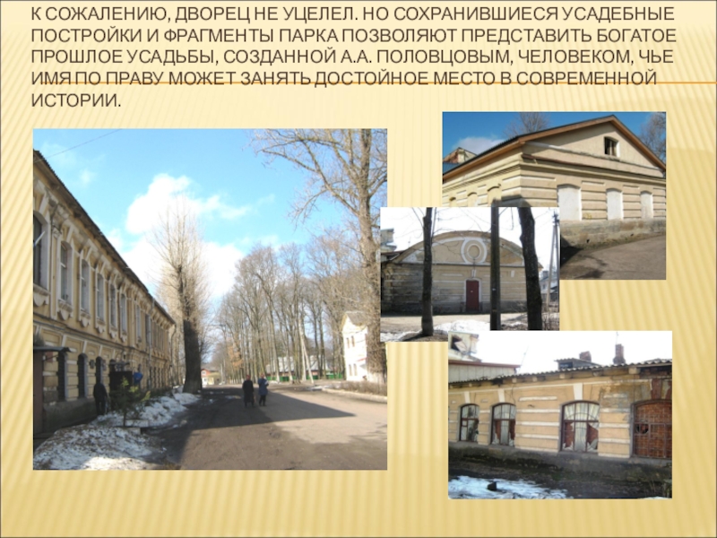 Слайд 16К СОЖАЛЕНИЮ, ДВОРЕЦ НЕ УЦЕЛЕЛ. НО СОХРАНИВШИЕСЯ УСАДЕБНЫЕ ПОСТРОЙКИ И ФРАГМЕНТЫ