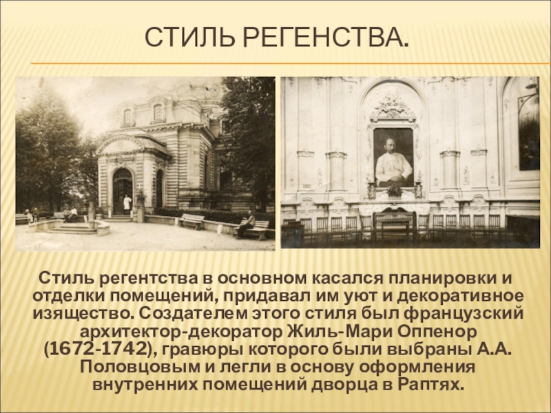 им уют и декоративное изящество. Создателем этого стиля был французский архитектор-декоратор Жиль-Мари Оппенор (1672-1742), гравюры которого были выбраны А.А. Половцовым и легли в основу оформления внутренних помещений дворца в Раптях.
