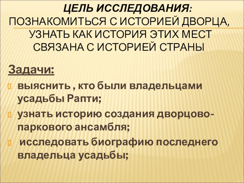 ЦЕЛЬ ИССЛЕДОВАНИЯ: ПОЗНАКОМИТЬСЯ С ИСТОРИЕЙ ДВОРЦА,