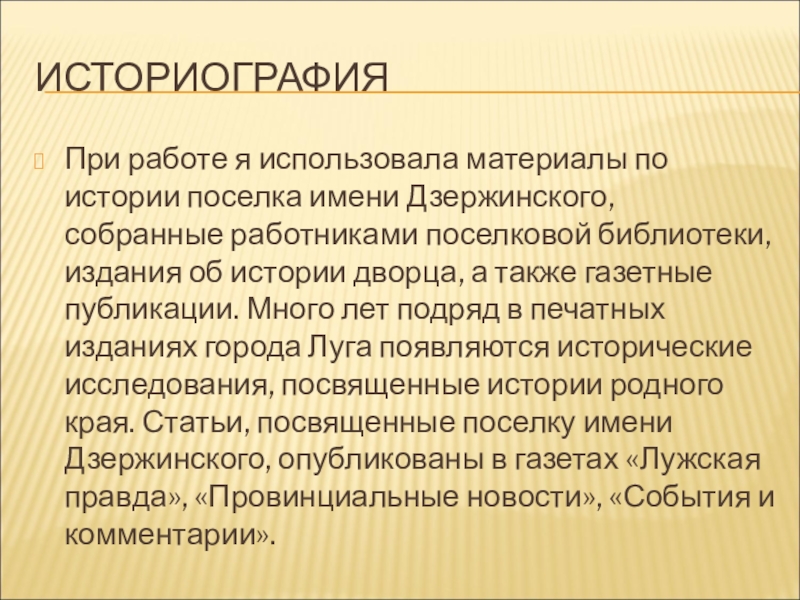 работниками поселковой библиотеки, издания об истории дворца, а также газетные публикации. Много лет подряд в печатных изданиях города Луга появляются исторические исследования, посвященные истории родного края. Статьи, посвященные поселку имени Дзержинского, опубликованы в газетах «Лужская правда», «Провинциальные новости», «События и комментарии».