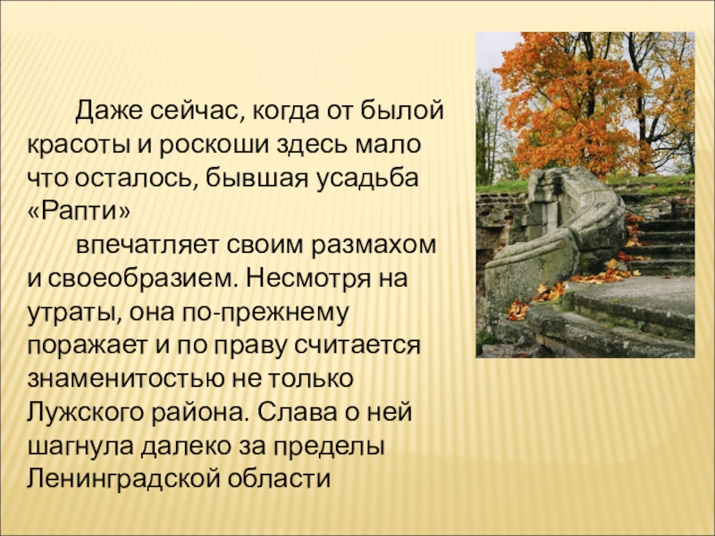 впечатляет своим размахом и своеобразием. Несмотря на утраты, она по-прежнему поражает и по праву считается знаменитостью не только Лужского района. Слава о ней шагнула далеко за пределы Ленинградской области