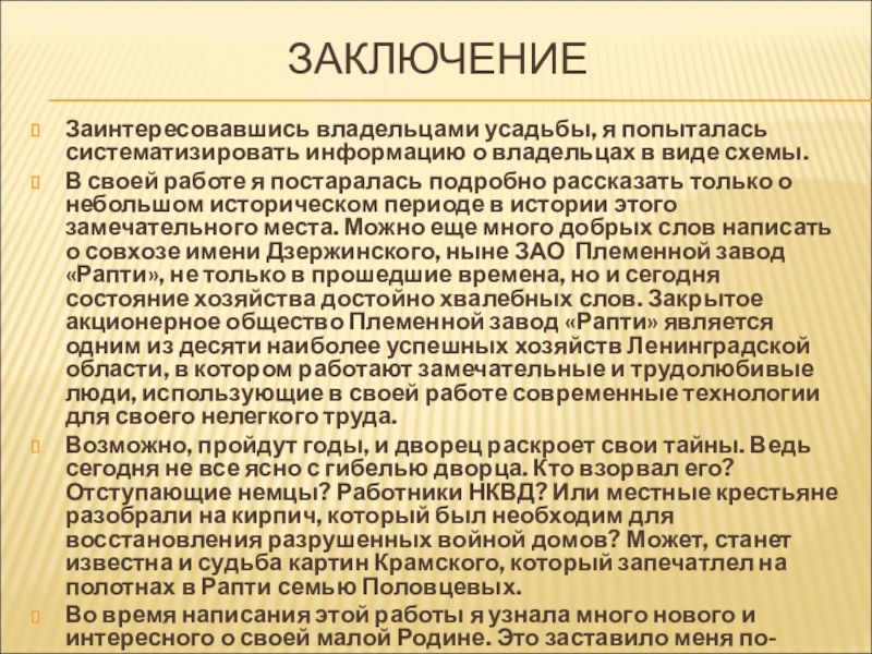 В своей работе я постаралась подробно рассказать только о небольшом историческом периоде в истории этого замечательного места. Можно еще много добрых слов написать о совхозе имени Дзержинского, ныне ЗАО Племенной завод «Рапти», не только в прошедшие времена, но и сегодня состояние хозяйства достойно хвалебных слов. Закрытое акционерное общество Племенной завод «Рапти» является одним из десяти наиболее успешных хозяйств Ленинградской области, в котором работают замечательные и трудолюбивые люди, использующие в своей работе современные технологии для своего нелегкого труда.